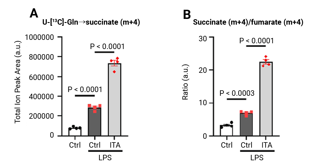 图 2. 在用或未用 ITA (7.5 mM) 预处理的巨噬细胞 (AMs) 中,随后用 LPS (500 ng/mL) 刺激 3 小时后,检测到的全 13C 标记琥珀酸 (H),以及 全 13C 标记琥珀酸与全 13C 标记的富马酸之比。[2]