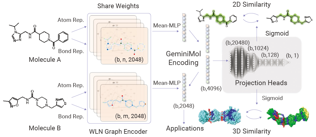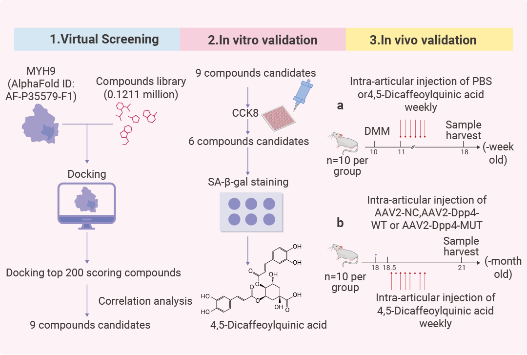 Section.03 AI 药物发现:研究案例 GeminiMol DL 模型加速大规模药物发现 GeminiMol 将构象空间特征融入分子表征学习,旨在捕捉分子结构与构象空间之间的复杂关联。该模型在 67 个分子特性预测、73 个细胞活动预测和 171 个零样本任务 (包括虚拟筛选和靶标识别) 中,利用构象信息的模型显示出优于传统表征方法的性能[9]。基于分子构象空间相似性描述符的对比学习框架是训练分子表征模型的有效策略,该策略能够快速探索化学空间并促进新的药物发现范式。 图 5. 通过分子间对比学习框架训练分子构象空间表征模型 GeminiMol[9]。 虚拟筛选驱动的 MYH9 抑制剂的高效鉴定 研究人员通过计算机虚拟筛选技术初步鉴定出可与 Human MYH9 蛋白特异性结合的小分子化合物。随后采用 CCK-8 细胞增殖 (HY-K0301) 检测法系统评估了这些化合物对原代小鼠软骨细胞增殖活性的影响,并运用 β- 半乳糖苷酶染色法 (HY-K1089) 检测其对细胞衰老进程的调控作用。在此基础上,研究团队进一步建立了小鼠骨关节炎 (OA) 模型,对这些化合物的治疗效果进行了体内验证。最终研究发现,4,5-dicaffeoylquinic acid 能够有效阻断 DPP4 与 MYH9 之间的蛋白相互作用,显著改善由 DPP4 过表达所导致的小鼠创伤后骨关节炎及衰老相关性骨关节炎的病理进程[10]。 图 6. 靶向人 MYH9 的药物筛选方案[10]。 MCE AI 驱动药物筛选平台 虚拟筛选通常依赖于计算机模拟和分子对接技术,通过计算分子间的相互作用来预测化合物的生物活性。AI 药物筛选是一种结合 AI 技术与计算化学的高通量筛选方法,广泛应用于蛋白结构预测、新药研发和分子设计与优化等领域。其主要目的是利用机器学习 (Machine Learning,ML) 算法分析大量数据,从中学习规律,生成 AI 打分函数,以此提高筛选效率,加速候选药物的发现过程。 MCE AI 药物筛选平台综合使用分子对接、机器学习、分子动力学模拟等方法,借助高性能服务器,能够在最短数小时内完成数千万分子的筛选,真正实现快速、高效! 图 7. AI 技术在药物发现中的应用。