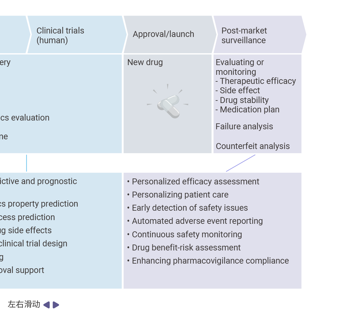 如今,AI 分析海量数据的能力正在重塑药物开发格局。从靶点识别、药物发现、临床前研究、临床试验到监管审评与上市后监测,AI 技术在整个研发链条中均展现出显著优势。这一变革潜力已促使制药企业、生物技术公司和研究机构广泛采用 AI 技术,以突破传统方法的局限[3]。  图 2. AI 在药物研发管线中的应用概述[3]。