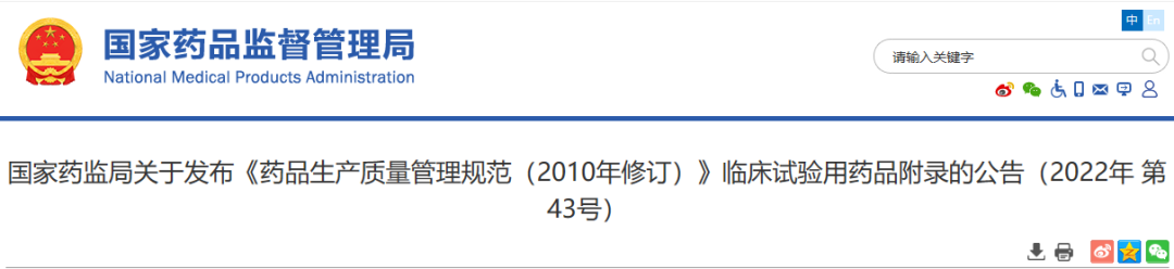 2022年05月27日,国家药监局发布了《药品生产质量管理规范(2010年修订)》临床试验用药品(试行)附录,全文14章51条,7月1日起生效。