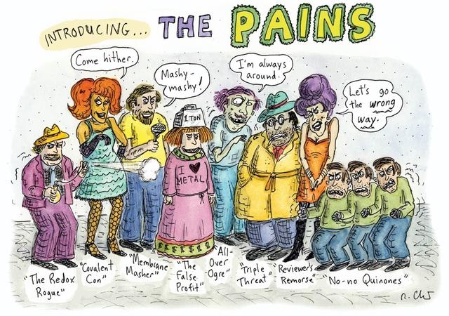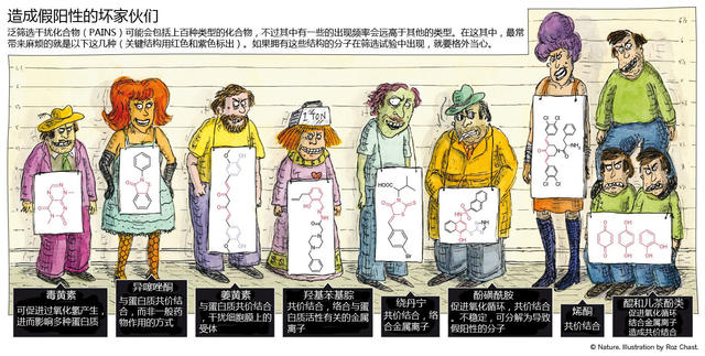 图片来自:Nature,漫画作者:Roz Chast (ALU/译)近年,新药开发领域炙手可热,大量研究人员蜂拥涌入。但是,他们当中很多人缺乏应有的引导,科研也做成了一团浆糊。每当生物学家们发现一个与疾病相关的靶点蛋白,他们就会想方设法寻找能够与这个蛋白质分子结合并影响其活性的化合物,这些有苗头的化合物常被称为“活性化合物”。一次典型的药物筛选流程能够找到数千种活性化合物,它们可以作为疾病机理研究的工具,也是寻找新药的基础。 但是,在筛选试验中,很多化合物展现出来的“活性”仅仅是一种假阳性结果——它们的“活性”并不是基于化合物分子与蛋白质之间特异性的作用。真正的药物能够精确作用于特定蛋白质的结合位点,从而抑制或激活蛋白质的功能。而“假阳性化合物”则伪装成药物结合的样子,在各种筛选研究中大放烟雾弹。 科学家们把这些坏家伙叫做pan-assay interference compounds(泛筛选干扰化合物),简称PAINS(这个缩写可谓物如其名,它们真是研究人员的心头痛)。PAINS有着明确的化学结构,横跨多个化合物种类。但是,很多生物学家和缺乏经验的化学家都不能一眼认出它们。相反,经常有科学论文把它们错当成有潜力的“药物候补”。为了优化PAINS的活性,大把时间和研究经费都打了水漂。化学家们耗费精力制作出各种类似物,试图提高PAINS和蛋白质之间的“结合性”。与此同时,真正有潜力的活性化合物却不得不坐上了冷板凳。 十年前,药物筛选工作主要由各大制药公司完成,这些公司往往有经验丰富的化学家提供技术支持。而现如今,越来越多的学术机构也开始进行药物筛选,同样水准的技术支持却未必存在。一个例子就是成立于2012年的学术药物开发联盟(Academic Drug Discovery Consortium),该机构目前已在9个国家成立了超过115家研发中心,并颇引以为豪。但是,学术机构中越来越多的药物研究人员缺乏相应的训练,无法区分“活性化合物”中何为良何为莠,何为捣蛋分子。 PAINS在筛选试验中表现出的“活性”极具诱惑力,于是出现了这种现象:即使已经有论文发表指出某种化合物会干扰筛选结果,关于该化合物的“活性”研究仍会继续。例如,2013年的一项研究发现了七种在筛选时能够与超过三分之一蛋白质发生作用的干扰化合物,但是这篇论文并未得到应有的关注。 像这样对多种蛋白质有反应、看上去大有前景的干扰化合物被研究人员们反复报道,相关数据充斥着整个化学界文献库。这些论文再三将假阳性分子错认为有效的新药,带动一轮又一轮的“筛选-发表-穷折腾”的恶性循环。药剂公司将这些假阳性化合物放进产品目录,号称是有发表论文支持的蛋白质抑制剂,导致其他生物学家也开始在自己的研究中使用这些化合物。  造成筛选假阳性的“罪犯”们。图片来自:Nature,漫画作者:Roz Chast。点击图片查看大图 尽管PAINS常被叫作“坏反应物(bad actors)”,但它们其实是相当优秀的“演员”:在假装自己“有潜力“方面简直堪称完美!乔纳森•贝尔(Jonathan Baell,也是本文作者之一)在自己的实验室因为假阳性物质白白浪费了两年后,于2010年首次发表了一篇关于识别PAINS的指南。而另外一位作者迈克尔•沃尔特斯(Michael A. Walters)在为一种试验中的杀真菌剂准备说明书和专利申请时,发现了很多名不副实的“活性“化合物,于是也开始了反PAINS的宣传之路。一个简单的例子就能说明PAINS为科研带来的危害:研究人员发现了一些能够与蛋白质发生非特异性作用的化合物,于是就花费了一年多的时间试图弄清个中机理,他们试遍各种方法,包括蛋白质聚集、化学分解、反应活性检验以及荧光测定,最终却没有收获。根据我们的估计,只要提高对PAINS的认识外加一些预防措施,就能避免无用功,为生物医学研究工作节省数年的时间以及数百万美元的研究经费。 海市蜃楼一个典型的学术药物筛选数据库中往往有5~12%的化合物属于PAINS,而且这些冒牌货还能被重复实验验证。大部分实验室青睐的“标配”数据库情况相似,例如大牌试剂公司Sigma-Aldrich提供的药理活性化合物数据库(LOPAC),以及美国国立卫生研究院(NIH)提供的分子库-小分子存储项目(MLSMR)。 大多数PAINS仅仅是有反应活性的化学物质,而非真正具有特异性的药物候选。它们用以瞒天过海的方法五花八门。有的PAINS能发出荧光或是自己有颜色,即使目标蛋白不存在时也能够表现出阳性反应。还有一些PAINS能捕获筛选实验中被用作试剂或反应物的金属元素,使得后者引发阳性反应,尽管这种反应与蛋白质本身没有半点关系。另外一些PAINS能够附着在蛋白质表面,或是与蛋白质功能相关的金属离子螯合,亦或是通过特异性结合以外的方法改变蛋白质的化学性质。在发现具有药物潜力的化合物后,研究者们会想方设法调整它们的分子结构,以提升其效果(这项手艺俗称“药物化学”),而前面提到的这些无疑会阻碍进一步的开发与研究。 因为不具特异性,PAINS的往往能够作用于多种蛋白。例如,在特定筛选条件下,一些分子会产生过氧化氢,而过氧化氢能够使目标蛋白失活,从最终结果看来这些化合物活像蛋白质抑制剂。但事实上,它们并没有与目标蛋白结合。 新的活性化合物被筛选出来后,下一步往往要在细胞中进行检验。在这一阶段,PAINS同样有多种花招扰乱人们的视线。它们能够让细胞表现出预期中的结果(譬如