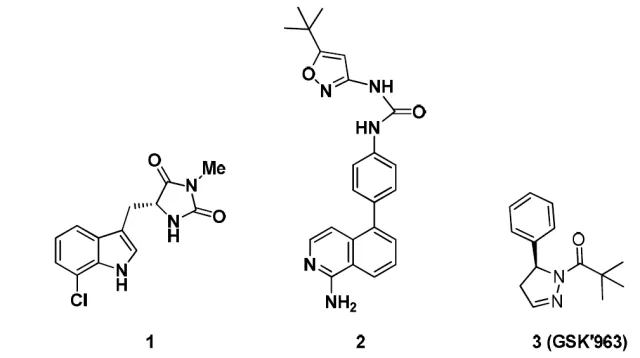 “一个优秀药物最终会耀眼地站在世界舞台的中间,她的成功注定不平凡,她走过的路将指引一批又一批制药人前行,我们在她的身上会得到宝贵的经验,比如先来一打优秀的Hits,比如,先用DNA编码化合物库筛选一个靶点。” ——编者注 起初Harris等在寻找RIP1抑制剂的时候并没有选择DNA编码化合物库筛选技术,而是对GSK的激酶抑制剂化合物库进行了筛选。筛选得到的一系列苗头化合物属于能够结合DFG-out构象的II型RIP1靶点的抑制剂,如下图2号化合物。但是这个系列的苗头化合物的分子量太大、亲水性弱并且常常脱靶的性质成为进一步优化的障碍。 随后他们采用高通量筛选技术对GSK的化合物库进行筛选,发现了化合物GSK963,如下图3号化合物。这个化合物在体外的数据较好,分子量小,效率高并且具有选择性。但是在啮齿动物中的口服效果不佳,限制了进一步的开发。