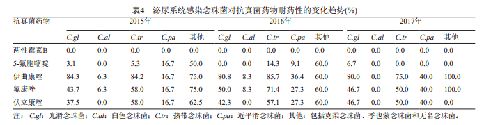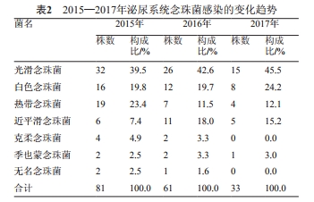 3年间,泌尿系统感染念珠菌均以光滑念珠菌占首位,构成比从2015年的39.5%上升到2017年的45.5%,呈逐年上升趋势,结果见表2。