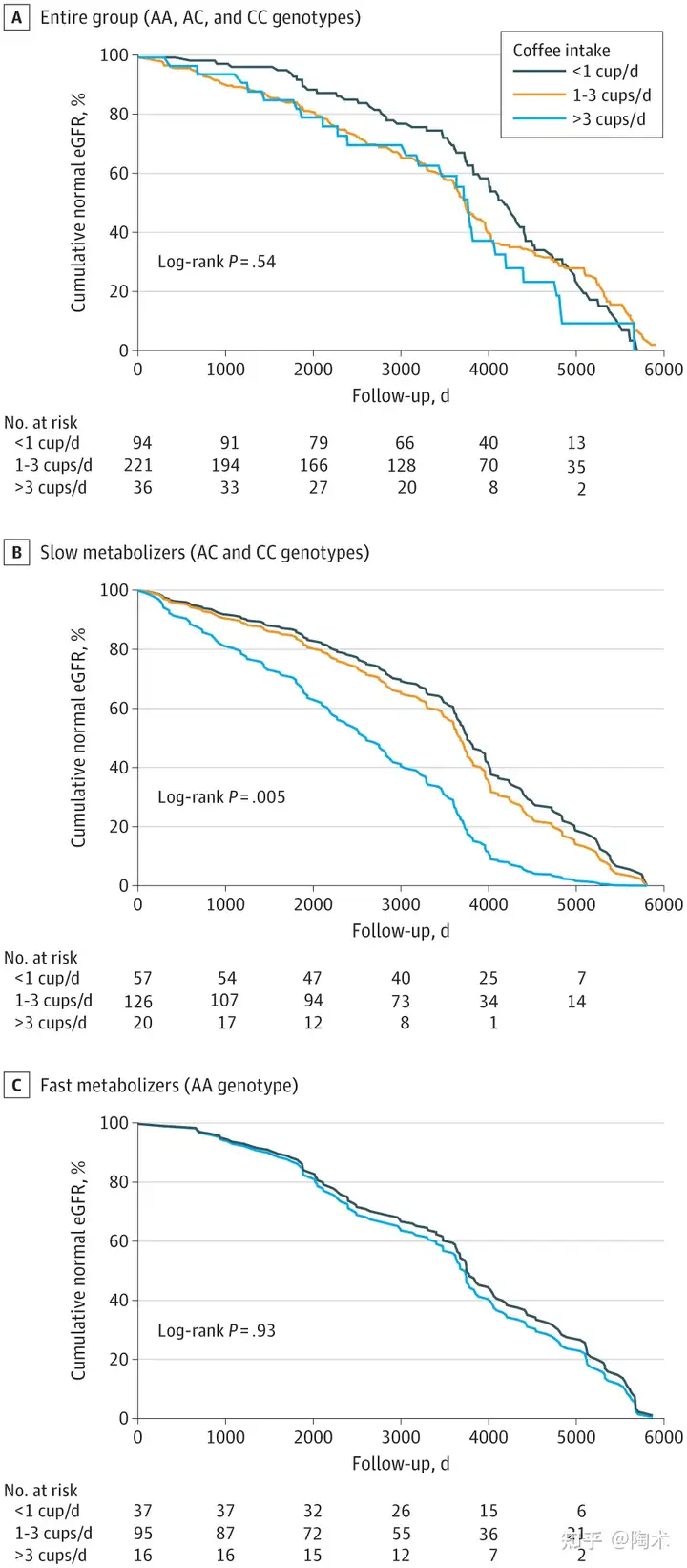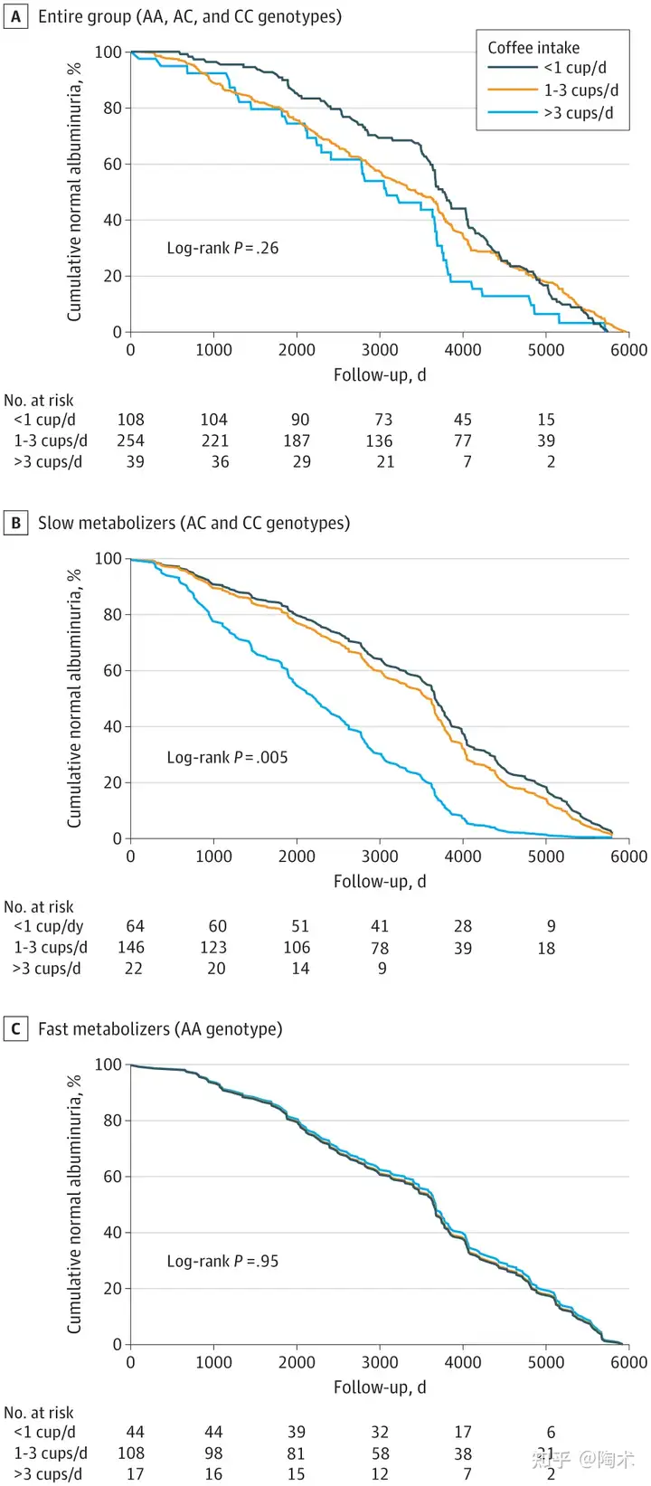 咖啡摄入量与基因型的关联研究最终获得了 604 名受试者的基因分型(CYP1A2 基因变体AC、CC:以下称慢代谢者和 CYP1A2基因变体AA:以下称快速代谢者),生活方式问卷以及尿液分析等数据。其中有 158 名每天饮用少量咖啡(每天<1杯),379 名每天饮用适量咖啡(每天1-3杯),67 名每天饮用大量咖啡(每天>3杯)。每杯咖啡约含 100mg 咖啡因。 通过对咖啡饮用量与白蛋白尿、高肾小球滤过率和高血压的累计发生率的各种分析发现: 研究结束时共有 407 名受试者有白蛋白排泄率(AER)记录。其中 52 名 AER 升高(16-29mg/24小时),更有 28 名检测到白蛋白尿(AER>30mg/24小时)。随着慢代谢者咖啡摄入量的增加,发生白蛋白尿的风险也显著增加。对快速代谢者则没有影响。