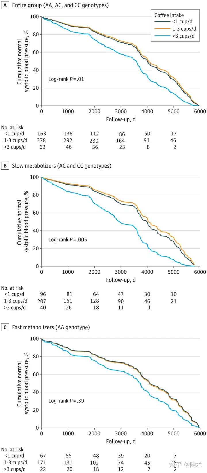 研究结束时共有 604 名受试者有临床收缩压和舒张压记录。其中 292 名检测出高血压(临床血压>140/90m Hg)。随着慢代谢者咖啡摄入量的增加,患高血压的风险提升了60%。对快速代谢者则没有影响。