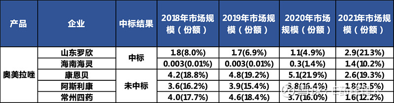 奥美拉唑国采后相关厂家市场规模(亿元)及市场份额变化