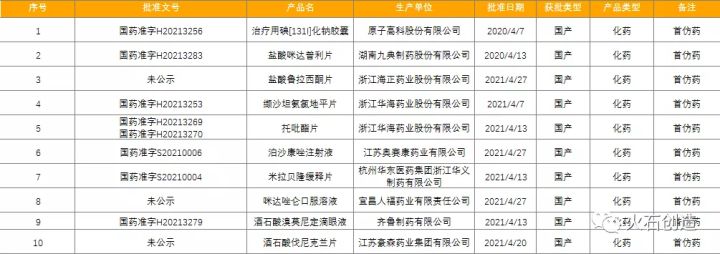 表3:2021年04月NMPA批准首仿药物列表