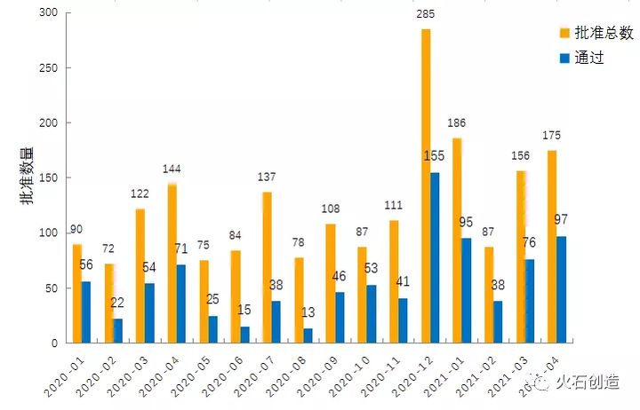 图3:2020年至2021年4月份仿制药一致性评价批准数量变化情况