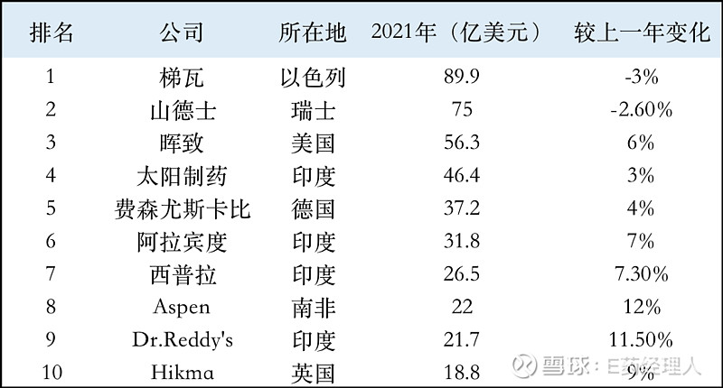 2021年全球仿制药巨头TOP10销售额(本图表中的数字不包括生物类似药的销售)