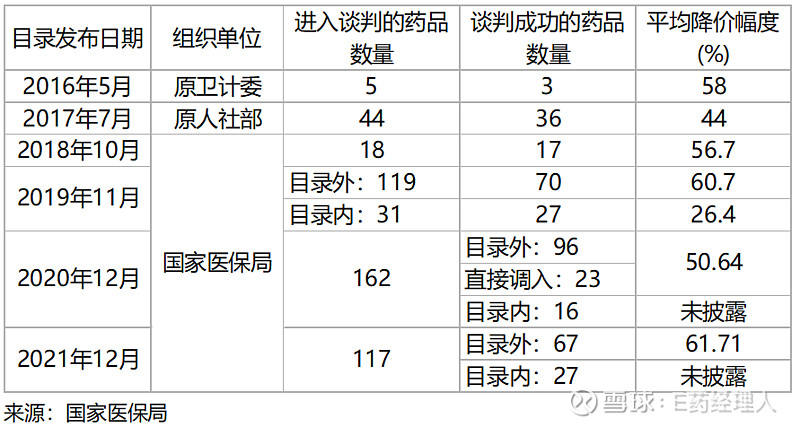 图表4. 2016~2021年针对新药和独家品种的国家药品价格谈判主要结果