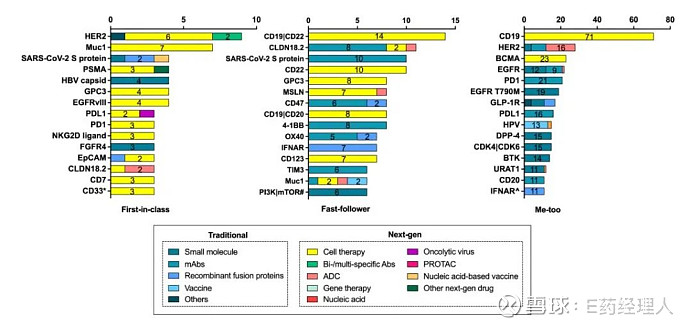 截至指导原则征求意见稿发布前日,中国在研me-too药物大量扎堆,针对CD19、BCMA的细胞治疗达到惊人的71个和23个,针对PD-1、PD-L1的单抗药物分别有21个和16个,针对EGFR T790M的小分子药物多达19个,针对HER2的ADC药物多达16个,在研HPV疫苗有13个。在小分子化药、单抗、疫苗、ADC等领域广泛出现靶标扎堆的现象,这显示中国的me-too药物进入了“内卷”时代。相比之下,first-in-class药物的竞争则缓和许多。