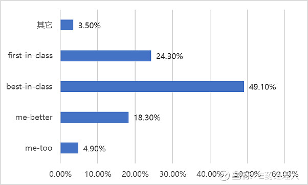 在635份问卷中,接近一半选择best-in-class药物进行开发,这与医药行业自媒体和会议论坛的主流声音差别很大。选择first-in-class、me-better、me-too的问卷依次减少,分别占24.3、18.3%、4.9%。由此可见,best-in-class药物能够较好均衡研发风险、融资难度、商业收益3大方面而成为优选;生命科学基础研究不足成为制约first-in-class药物研发的瓶颈;me-too药物则基本上已被抛弃。