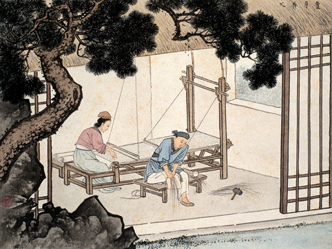 江革, 东汉时齐国临淄人,少年丧父,侍奉母亲极为孝顺。战乱中,江革背着母亲逃难,几次遇到匪盗,贼人欲杀死他,江革哭告:老母年迈,无人奉养,贼人见他孝顺,不忍杀他。后来,他迁居江苏下邳,做雇工供养母亲,自己贫穷赤脚,而母亲所需甚丰。明帝时被推举为孝廉,章帝时被推举为贤良方正,任五官中郎将。