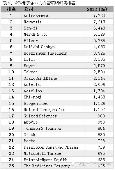 2013年心血管领域药品销售额超过50亿美元的公司同样有5家,分别是阿斯利康(AstraZeneca)、诺华(Novartis)、赛诺菲(Sanofi)、默克(Merck&Co.)、辉瑞(Pfizer),前5大企业销售额合计333亿美元。