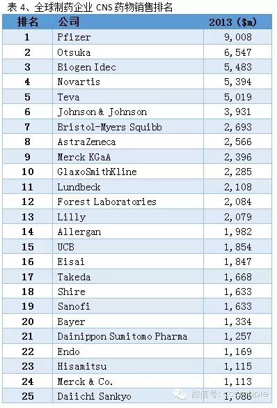 中枢神经系统领域,辉瑞(Pfizer)、大冢(Otsuka)、百健艾迪(BiogenIdec)、诺华(Novartis)、梯瓦(Teva)2013年该领域销售额分别位列前五名,均在50亿美元以上。