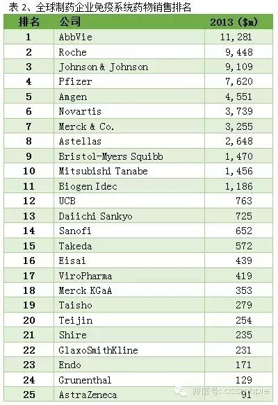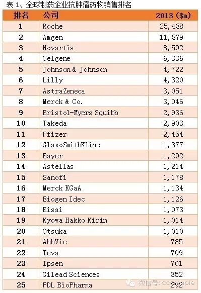 抗肿瘤药物领域,罗氏(Roche)公司可谓一家独大,2013年抗肿瘤相关药物销售额达254亿美元。罗氏的霸主地位主要得益于收购基因泰克(Genentech)获得了赫赛汀、阿瓦斯汀、美罗华等重磅抗肿瘤单抗药物产品。紧随其后,安进(Amgen)公司以119亿美元的销售额位列第二,其余制药企业在抗肿瘤领域的销售额则呈现快速下降趋势,排名第25名的PDLBioPharma销售额仅为2.92亿美元,行业集中度较高。