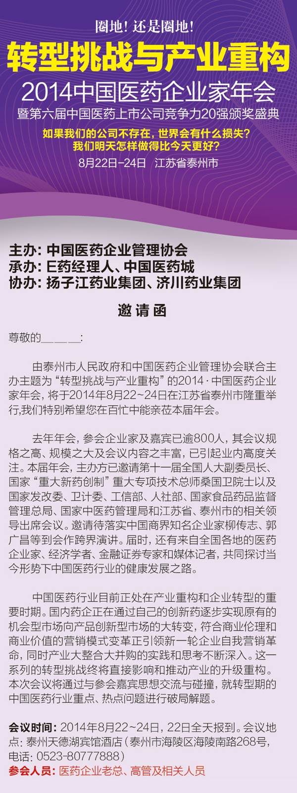 [其他] 【行业盛典】2014年中国医药企业家年会8月开幕! |