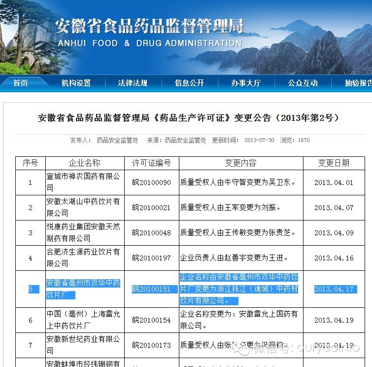 上图为安微省食药监局变更公告