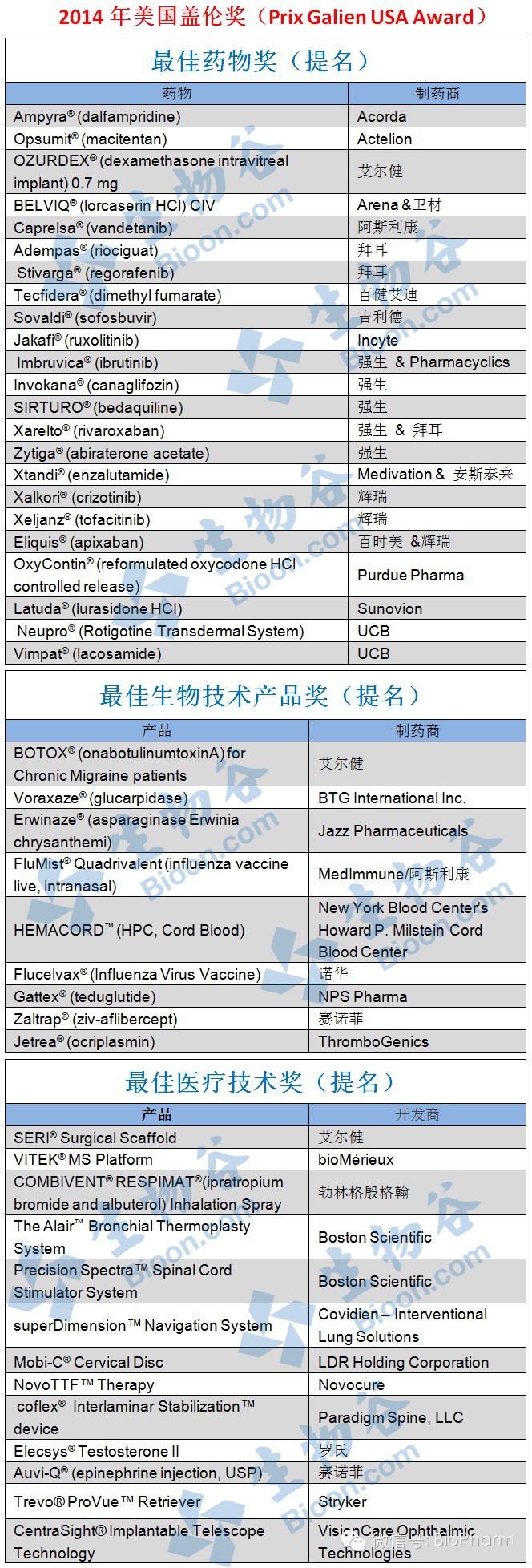 [行业动态] 盘点:医药界的诺贝尔奖——2014年美国盖伦奖(Prix Galien Award)提名产品 |