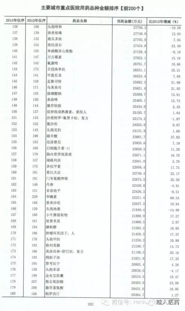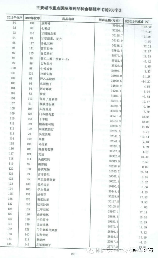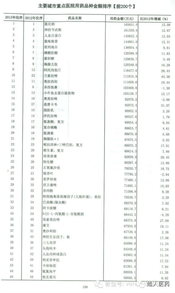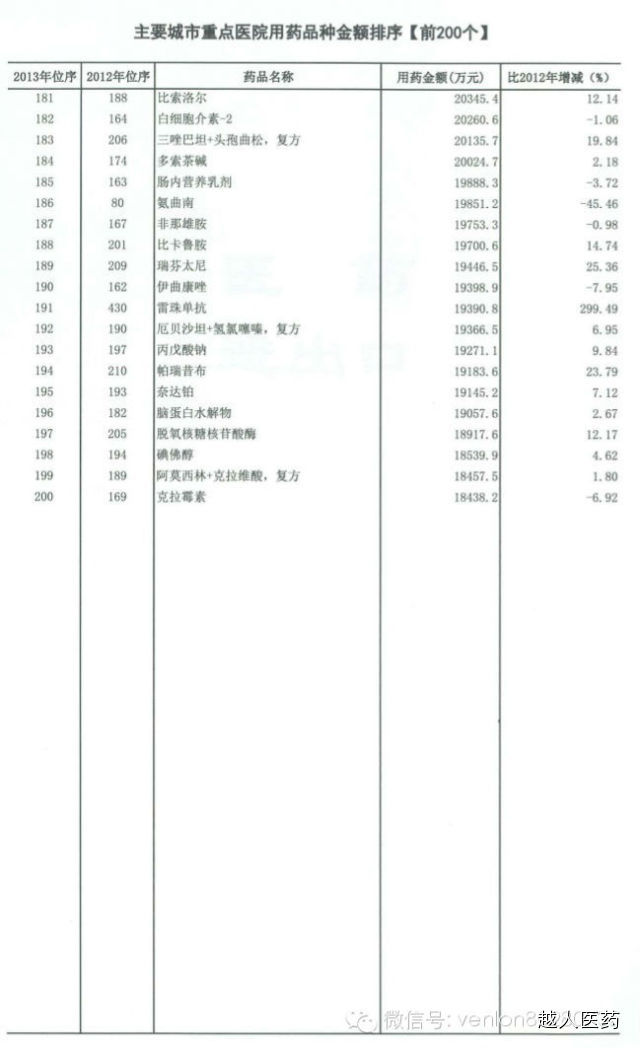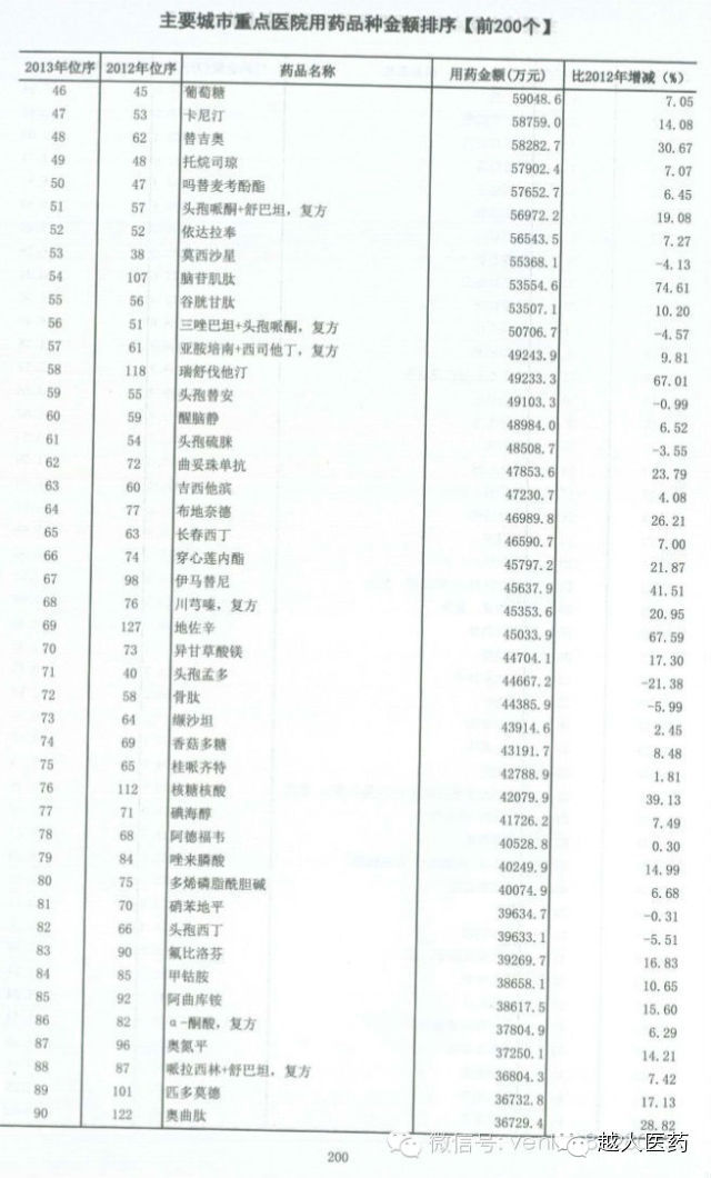[药界资讯] 全国医院用药品种金额排序(前200位)