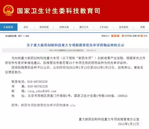卫计委:关于重大新药创制科技重大专项拟推荐优先审评药物品种的公示。
