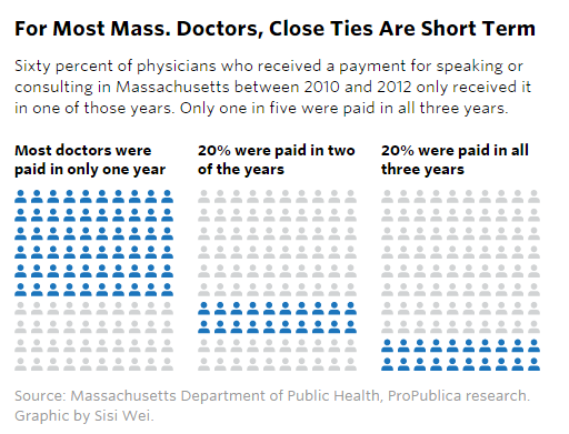 ·而且,有的医生与制药公司的“合作关系”看起来还是长期且持久的。数据显示,马塞诸塞州有20%的医生在2010~2012年中每年都收取制药企业的付款。而这些人也是这三年中该州收入最高的医生群体。