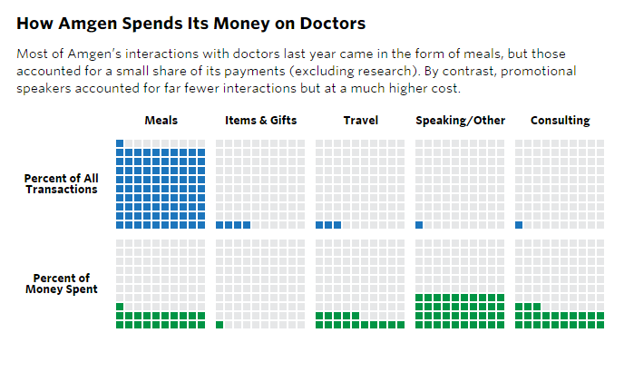 ·在美国安进公司2013年5.5万份不包括科研补贴的支付报告中,餐饮补贴占到了接近5万份,也就是大约91%的样子。不过从另一个角度看,安进公司当年对医生支付的餐饮补贴为310万美元,仅占到了总支出的20%。相比之下,该公司花费在支持600名医生演讲领域的费用几乎是餐饮补贴的两倍,达到了600万美元。