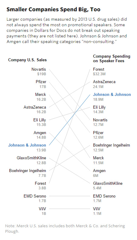 ·2013年,美国境内药品销售额最高的制药公司分别是诺华和辉瑞。森林实验室的销售额比他们低很多,但在给医生促销性演讲活动提供经费这块,该公司却轻易战胜了两大巨头。森林实验室2013年用于支付医生促销性演讲的支出总额为323万美元,相比之下诺华数据仅为127万美元,而辉瑞则仅有126万美元。