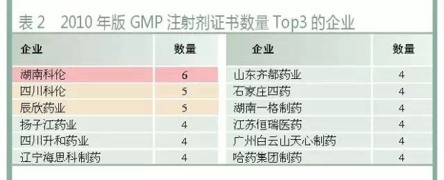 以企业所获得的GMP(2010年版)证书数目来排名,湖南科伦获得的注射剂证书数最多,共6个;其次是四川科伦药业和辰欣药业,各获得5个证书;扬子江药业、四川升和药业、辽宁海思科制药、山东齐都药业、石家庄四药、湖南一格制药、江苏恒瑞医药、广州白云山天心制药和哈药集团制药总厂,各获得4个证书。