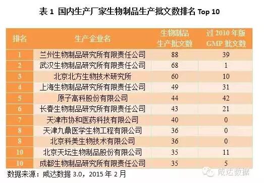 截止至2015年2月2日,我国的生物制品共有批文国内1889条,占目前国内数据库168977条的1.12%。进口445条,共有2334条批文。如表1所示,从生产批文数来看,排名前10位中,属于地方生物制品研究所的有5家。兰州生物制品研究所的批文数最多,81条;其次是武汉生物制品研究所,68条;北京北方生物技术研究所排第三,共60条。