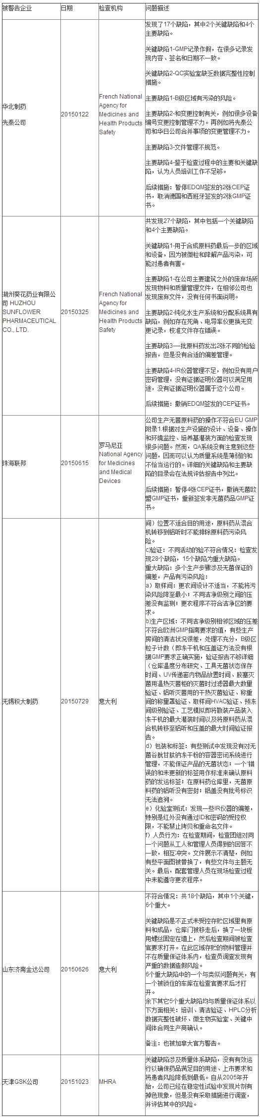 2015年在中国制药行业发展史上,注定是一个不平凡的年头。不仅国内各类医药法规和政策频繁出台,监管力度日趋严厉。国际药政机构也频频对国内制药企业发起更严厉的检查。到2015年10月底,中国制药企业在针对美国FDA、欧盟各药政机构、加拿大官方检查中,已经有多个制药企业失败,被发现有严重缺陷。他山之石,可以攻玉。笔者汇聚和解析这是失败的案例,以期为意欲开拓国际市场的相关企业提供教训和值得参考的地方。