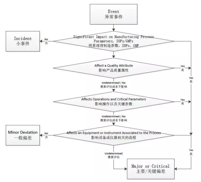 如果判断为偏差,需要对其按照Minor, Major和Critical进行进一步的分类。如果三个判断框答案均为否的情况下,可以判断偏差为Minor(一般偏差)。