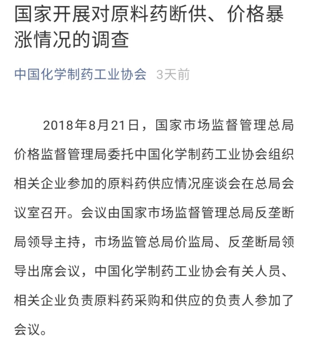 事实上,为遏制原料药垄断,近几年国家一直在重点开展反垄断调查,严惩垄断涨价的行为。