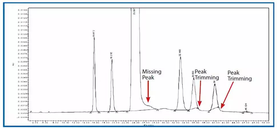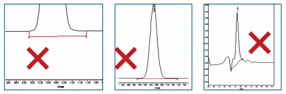 抑制或忽略图谱中的任何峰 (图8 不恰当的积分举例) ✔科学合理的解释说明 ✔相关物质检测中:空白峰,对照峰,溶剂峰等 ✔所有按要求积分的峰都应该积分,积分限的设定(USP <621>报告限的一半) ✔已知原因的异常峰可以被剔除 ✔未知峰应积分并按照SOP的规定调查