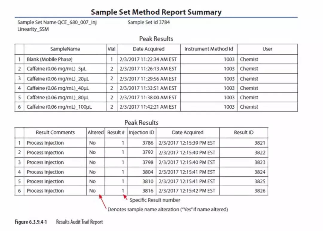 ・结果审计跟踪(或进样审计跟踪):色谱图或报告提供结果审计追踪。图15是一个结果审计跟踪报告模板,它显示了积分类型、获取的日期、处理的日期以及由谁处理的日期,以及在生成数据之后色谱图是否被改变。色谱图通常应包含: 样品描述 ,样品采集的日期和时间,处理结果的日期和时间(如果有),最小的方法参数,比如波长、进样量和方法 名称/ID号,积分类型,保留时间、打印、发布或保存时间,积分事件,执行后的样品名称变更 。