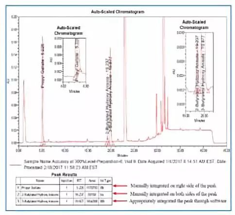 尽可能避免手动积分:(参考图4-7 手动积分管理案例) ✔有SOP规定 ✔通过权限控制(主管批准,在台账中记录) ✔预先规定可以手动积分的情况 ✔持续出现不好的色谱峰或基线,应采取措施改进系统或方法(确保数据的持续性和可靠性) 图4典型的自动和手动积分 图5 适当比例,清晰基线和积分,单个完整峰的典型图谱 图6 比例不恰当,基线和积分不清晰的典型图谱 图7比例恰当,能看到没有积分的峰和消减过的峰 发现了可能的篡改