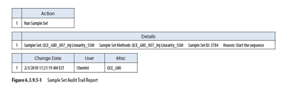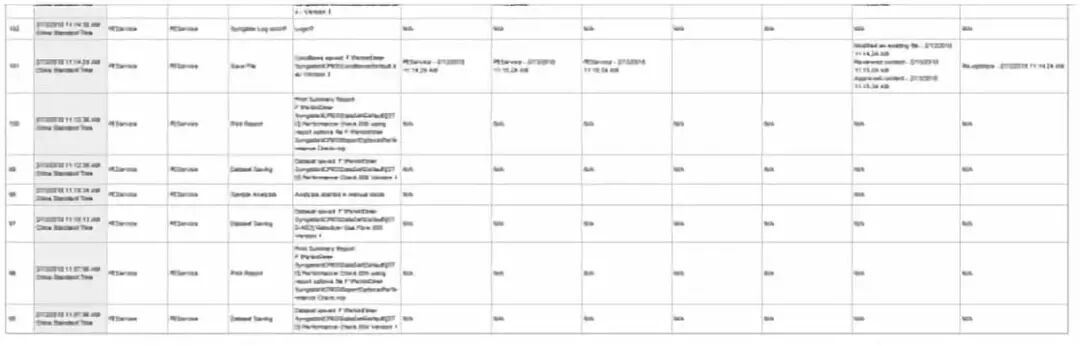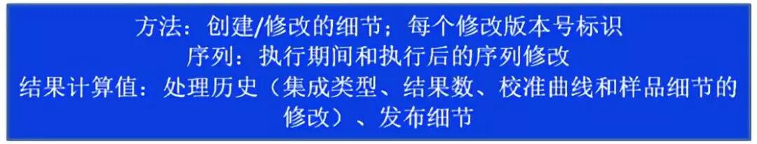 例如,对于HPLC运行的审核跟踪可以包括运行的用户名、日期和时间、积分使用的参数,以及再处理的细节,如果有的话,包括变更的理由。此外,进样日志可以包括在内,但是这个进样日志不包括审计跟踪进样信息(空白/系统适用性/批号)。进样日志指仪器运行停止的记录过程,这个日志不包含具体信息,一般是start/stop的状态记录或者是仪器部件运行的过程比如探针伸入,转盘转到位置等。【解释了审计追踪和仪器进样日志的区别】