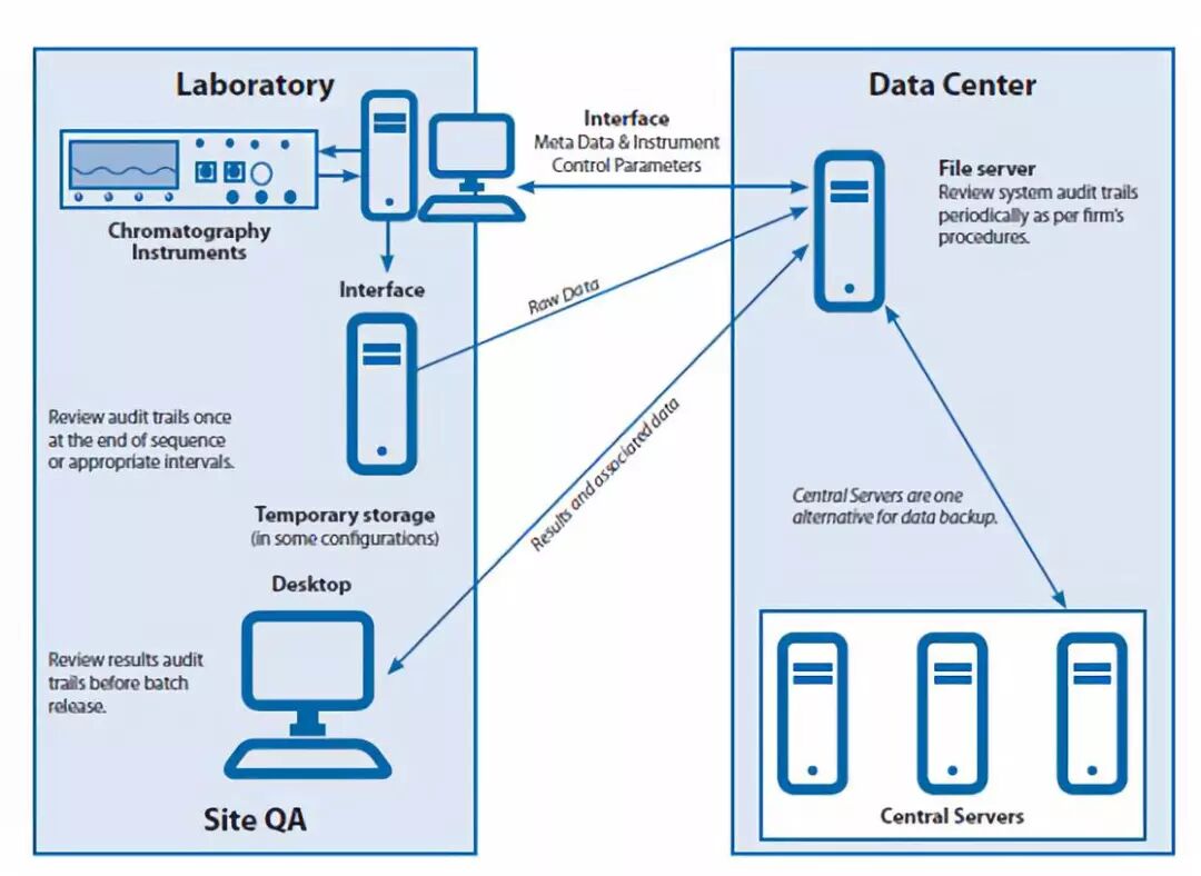 在当先的QC实验室中这类混合系统是普遍存在的,而且本质上也和纸质记录简单系统一样是不可避免的,更重要的是如何建立可信的监控体系去运营。往往合理的检察官会根据这些混合系统产生数据的质量安全重要性来判断这类缺陷的重要级别。比如如果你的称重条是非常重要的含量指标或是制剂溶出均一性指标的数据来源,那么这类混合系统的缺陷将会直接上升到关键级别,因为其直接影响到了产品的质量关键特性。 复杂系统一般指的是分析实验室计算机化系统,包括HPLC、GC、PSD、UV、IR、ICP-MS、XRD等各种类型的仪器操作系统以及LIMS之类的数据集成系统。复杂系统应该至少包括:分析仪器硬件本身,软件操作系统,操作平台和手册,操作管理维护SOP和经过培训的分析测试人员和数据复核QA人员。在目前的实际工作中,单机版系统、服务器版本系统和远程云端版本系统都有实际应用的情况存在。我们目前可以明确的说单机版软件系统存在固有的缺陷是重复测试管理和数据审核困难的问题,并同时存在数据的保存、备份和恢复的困境,这些都是单机版本软件固有的不可能弥补的风险缺陷。在本文中,我们没有针对单机版系统专门进行展开讨论,读者可以结合网络版的风险分析点进行单机版软件的风险点分析。
