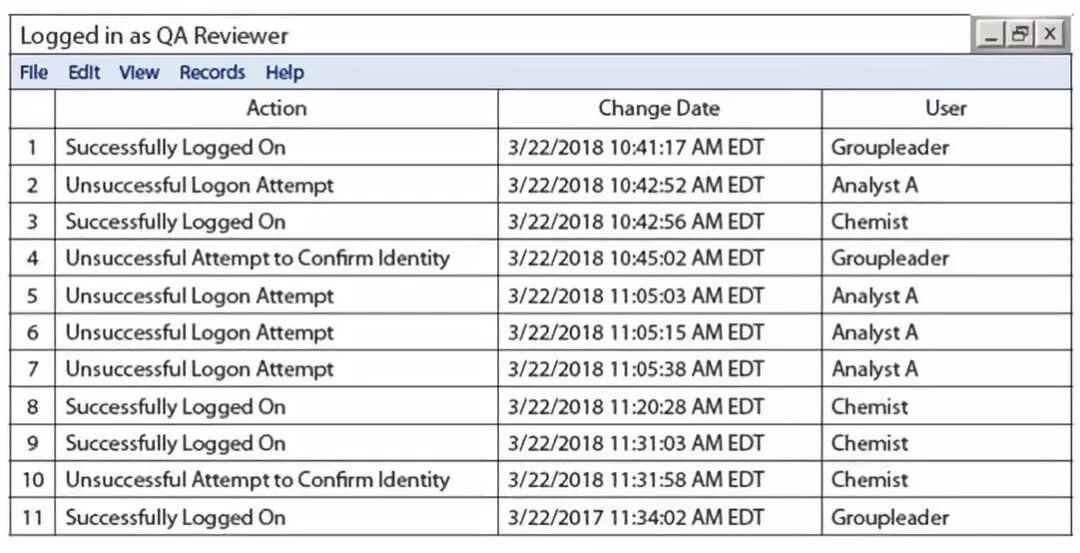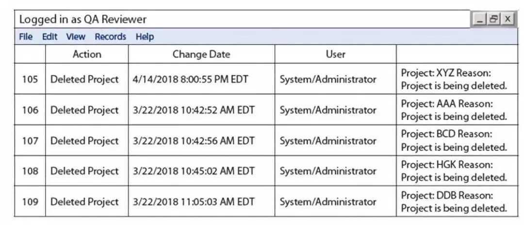 系统审核跟踪覆盖了系统策略更改、用户活动相关的活动(登录、注销、未经授权的登录和用户权限更改,对项目的更改(创建、删除、修改和恢复),证明项目的完整性和对系统的变更。质量系统应回顾system audit trail为任何类型的删除动作建立的周期性检查。图12显示了系统审计跟踪中典型的项目删除。审核系统跟踪 在调查中检查登录和注销时间以及任何基于系统的信息 ,这不是在应用程序级审计跟踪上捕获的。