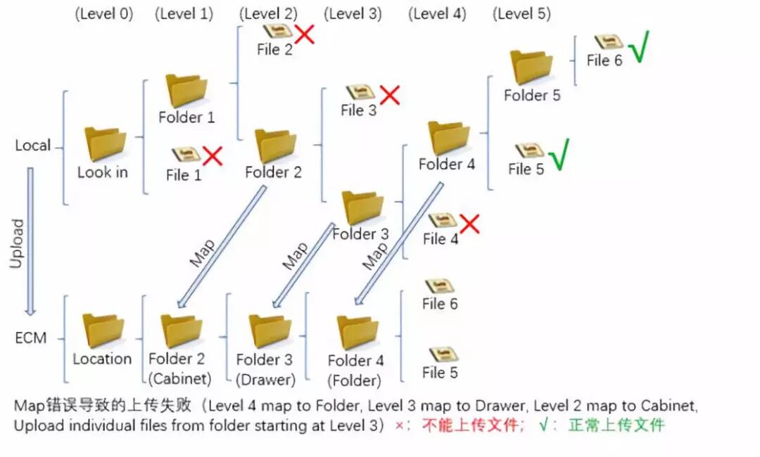 例4 一个映射层级错误的示例,按照上传层级配置应该上传的第3级文件(File 4),由于Map错误将不会上传。 注:ECM提供了建立ECM存储和本地存储的直观关联的方式——Map模式,使用Map模式时要考虑Map层级与上传层级之间的关系。一个容易犯的错误是,文件上传开始层级设定值高于本地与ECM中Folder对应的文件夹,导致本地文件无法归属到具体的Folder(ECM),从而无法上传。