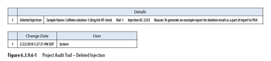 图17 典型的序列审计跟踪 ✔项目审计跟踪:通过启用审计跟踪选项时可以激活,项目将捕获关于样本集、进样、通道、结果、校准曲线和峰执行的所有活动。图18显示了项目审计跟踪记录一个删除的事件,来展现欺诈性数据的示例。