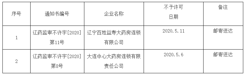 根据《中华人民共和国药品管理法》及其实施条例和《药品经营许可证管理办法》规定,经我局审查,辽宁百姓益寿大药房连锁有限公司等2家企业不符合要求,本机关决定不予批准。