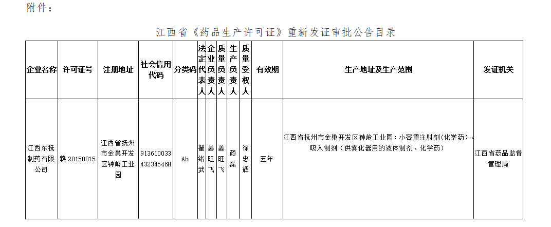 根据《药品管理法》《药品生产监督管理办法》要求,经资料审查、现场检查和审查公示,江西东抚制药有限公司小容量注射剂(化学药)基本符合药品GMP及相关附录要求,吸入制剂(供雾化器用的液体制剂,化学药)符合法定药品生产条件,同意予以重新发放《药品生产许可证》。