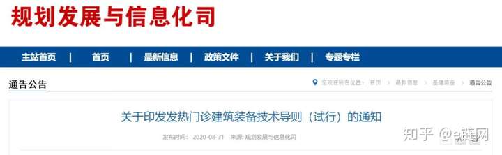 8月31日,国家卫健委规划发展与信息化司发布《发热门诊建筑装备技术导则(试行)》(下称《技术导则》),适用于医院发热门诊的新建、改建和扩建项目。