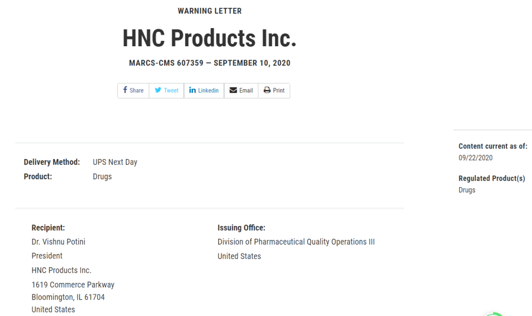 The U.S. Food and Drug Administration (FDA) inspected your drug manufacturing facility, HNC Products Inc., FEI 3000205427, at 8631 Sunset Road, Clinton, Illinois, from March 10 to 17, 2020. 2020年3月10日至17日,美国FDA检查了你的药品生产设施HNC Products Inc,FEI 3000205427,位于伊利诺伊州克林顿的8631 Sunset 路。 This warning letter summarizes significant violations of current good manufacturing practice (CGMP) regulations for finished pharmaceuticals. See Title 21 Code of Federal Regulations (CFR), parts 210 and 211 (21 CFR 210 and 211). 该警告信总结了严重违反制剂CGMP规定的情况。请参阅21CFR第210和211部分。 Because your methods, facilities, or controls for manufacturing, processing, packing, or holding do not conform to CGMP, your drug products are adulterated within the meaning of section 501(a)(2)(B) of the Federal Food, Drug, and Cosmetic Act (FD&C Act), 21 U.S.C. 351(a)(2)(B). 由于你用于生产、加工、包装或储存的方法、设施或控制措施不符合CGMP,因此根据FD&C法案501(a)(2)(B)条及21 U.S.C.351(a)(2)(B) 条的规定,你的药品被认为是掺假。 Our inspection also revealed that your firm failed to fulfill its registration and listing obligations under section 510 of the FD&C Act, which is prohibited under section 301(p), 21 U.S.C. 360 and 331(p). As a result, your drugs are misbranded under section 502(o) of the FD&C Act, 21 U.S.C. 352(o). 我们的检查还显示,你的公司未履行FD&C法案第510条规定的注册和上市义务,331(p)条对此予以禁止(即21 U.S.C. 360 和 331(p) 条款)。因此,根据FD&C法案第502(o)(即21 U.S.C. 352(o)),你的药品属于表示错误。 We reviewed your April 3, 2020, response to our Form FDA 483 in detail and acknowledge receipt of your subsequent correspondence. 我们详细审查了你2020年4月3日对FDA 483表格的答复,并确认收到你的后续信件。 During our inspection, our investigator observed specific violations including, but not limited to, the following. 在我们的检查过程中,调查人员发现了具体的违规行为,包括但不限于以下行为。