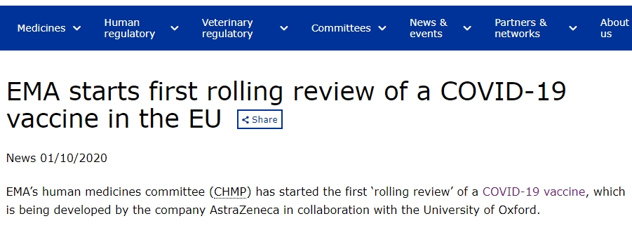 10月1日,EMA发布公告,其下属的人药委员会(CHMP)已开始对新冠疫苗开启首次“滚动评审”,该疫苗是由阿斯利康(AstraZeneca)公司与牛津大学合作开发。