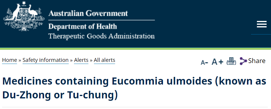 Ref.: Medicines containing Eucommia ulmoides (known as Du-Zhong or Tu-chung). 13 January 2021. TGA.