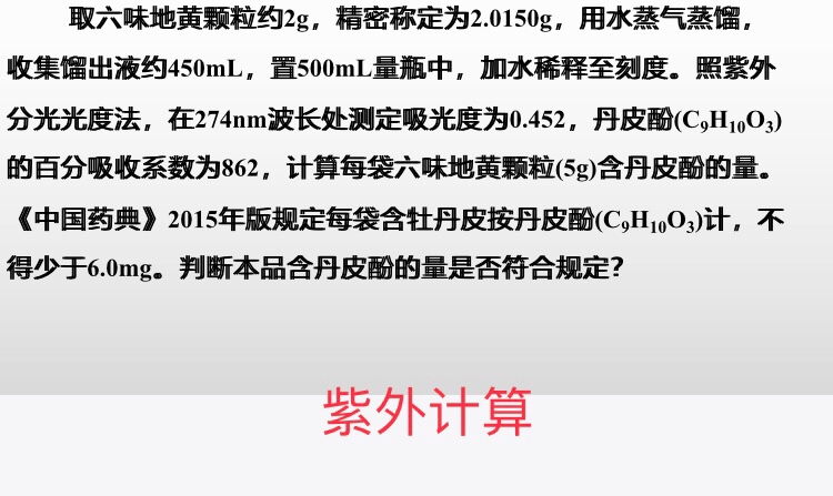 wwwlhy1989 发表于 2021-05-18 13:49 A=Ecl c=A/El c=m/v 含量=C测得/C实际=(A/El)/(m/v)=(0.452/862*1*100)/(2.0150/500) 每袋含量=含量*5g=6.5mg