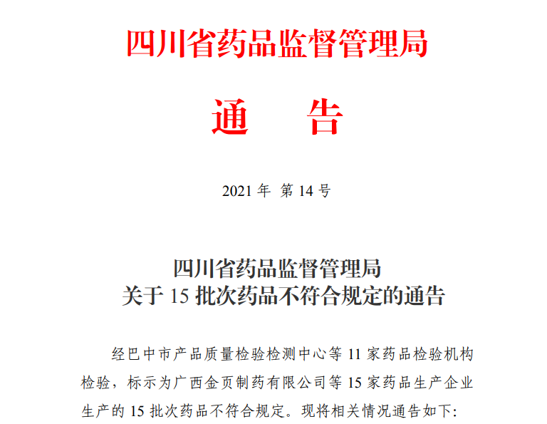 经巴中市产品质量检验检测中心等11家药品检验机构检验,标示为广西金页制药有限公司等15家药品生产企业生产的15批次药品不符合规定。现将相关情况通告如下: 一、经巴中市产品质量检验检测中心检验,标示为广西金页制药有限公司生产的1批次复方穿心莲片不符合规定,不符合规定项目为性状。