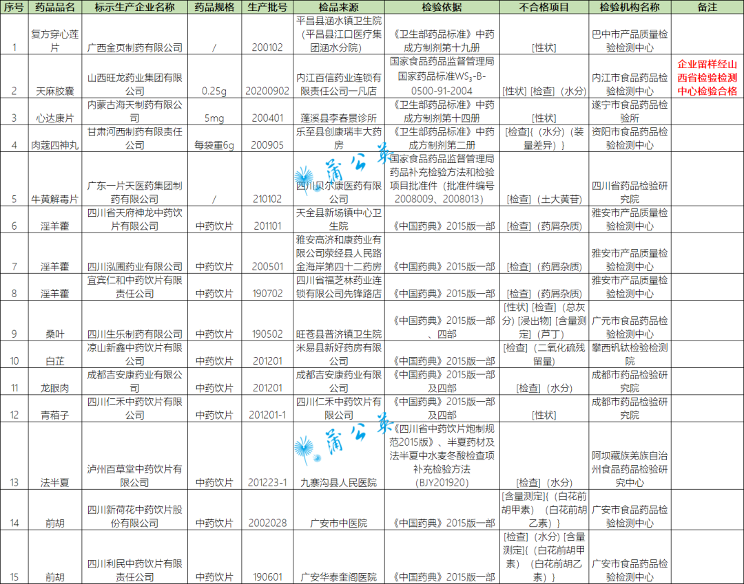2021年12月25日,河北、四川药监局先后发布了质量公告,共计16批次产品经抽检不符合规定,涉及制剂6个品种6批次、饮片7个品种10批次。
